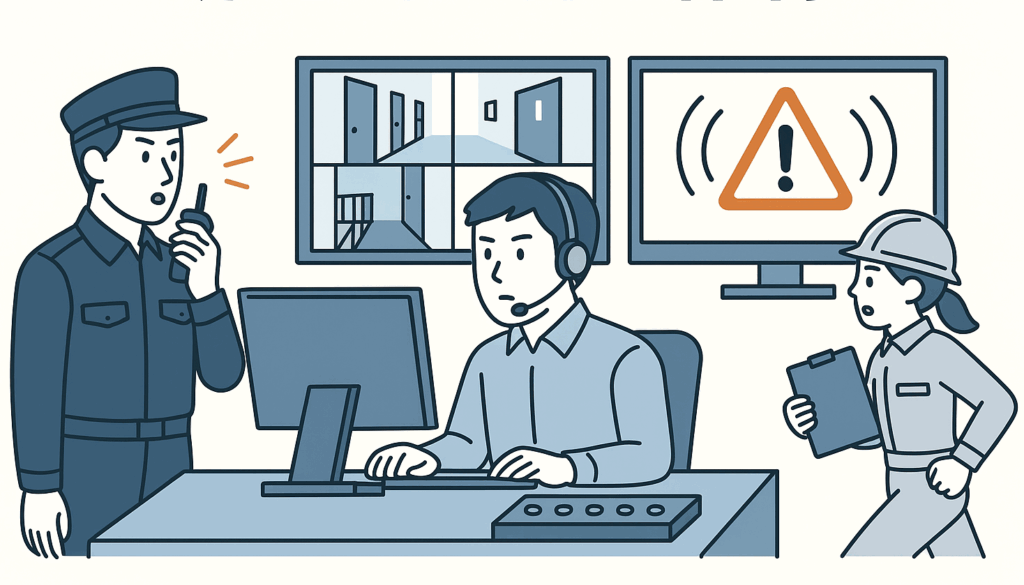 例えばオーナーや管理人が徒歩圏内に居住している場合や、近隣に待機事務所を構えている場合、あるいは警備会社と契約して非常ボタン押下で急行してもらう等の方法が考えられます。