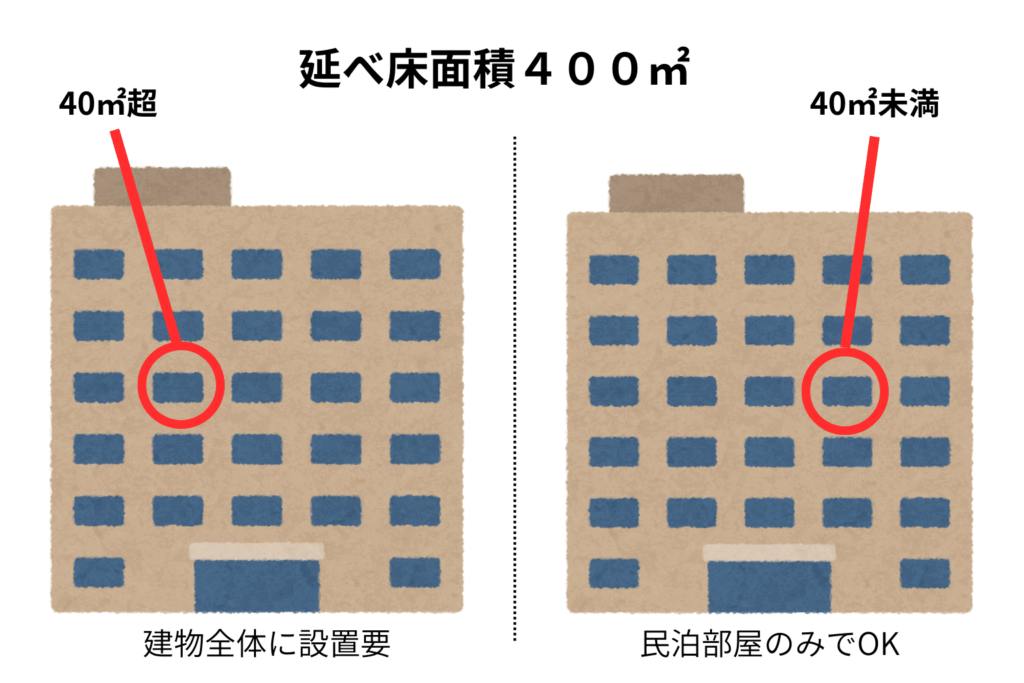 民泊の床面積が延床面積の10%以下なら、民泊部分だけ設置すれば足ります。