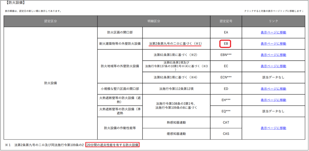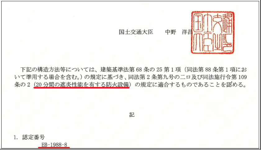 法第二条第九号の二ロに定める20分間の遮炎性能を有する防火戸(防火設備)は【EB-〇〇〇〇】という認定コードが触れれています。